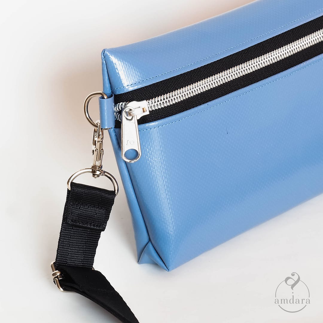 Die Bauchtasche Saira – Unifarben schwarz matt ist eine kleine, schlanke Bauchtasche aus robuster, wasserfester und abwaschbarer Blache. Sie kann ganz klassisch um die Hüften, als Crossbody Tasche unterhalb der Brust oder auf dem Rücken Umhängetasche getragen werden.