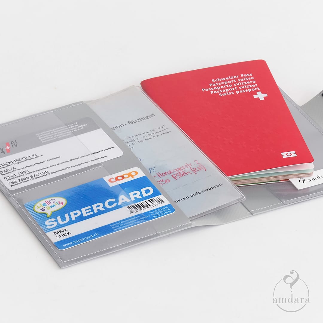 Neben einem Fach für den Pass und einem Fach für den Impfausweis hat die Hülle zwei transparente Fächer für Karten wie ID, Kreditkarte, AHV-Ausweis und mehr. Zudem gibt es ein weiteres transparentes Fach für grössere Ausweis, Reiseunterlagen (A4 zweimal gefaltet) oder weitere Karten.