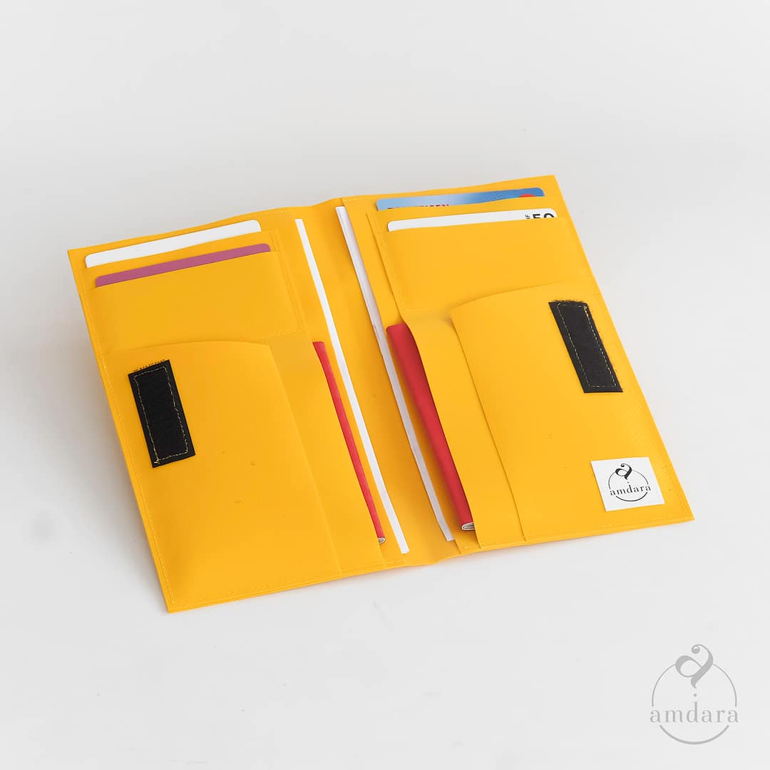 Diese Reisemappe ist dir zu klein und du hättest gerne mehr Platz für Reisedokumente oder für weitere Pässe? Dann schau dir die Reisemappe gross an. Diese fasst A5 Dokumente (einmal gefaltete A4 Blätter) und hat 4 Passfächer.