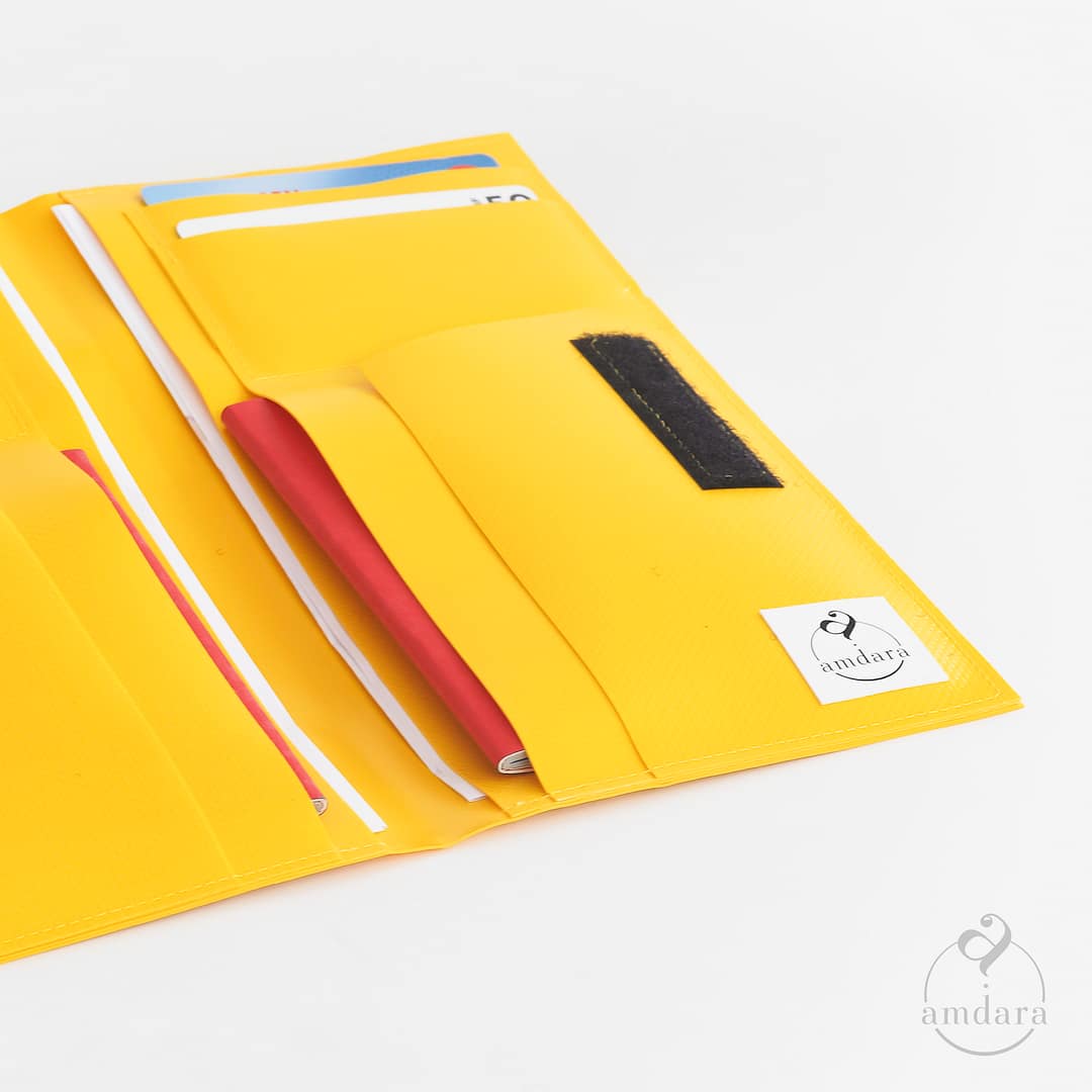 Die Mappe ist aus robuster und wasserabweisender Blache. Somit bietet sie optimalen Schutz für alles, was man auf der Reise gerne stets griffbereit hat.