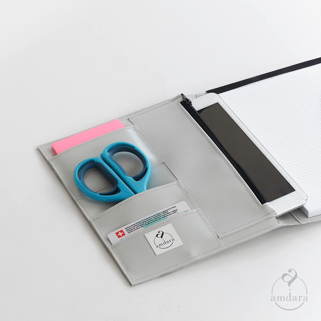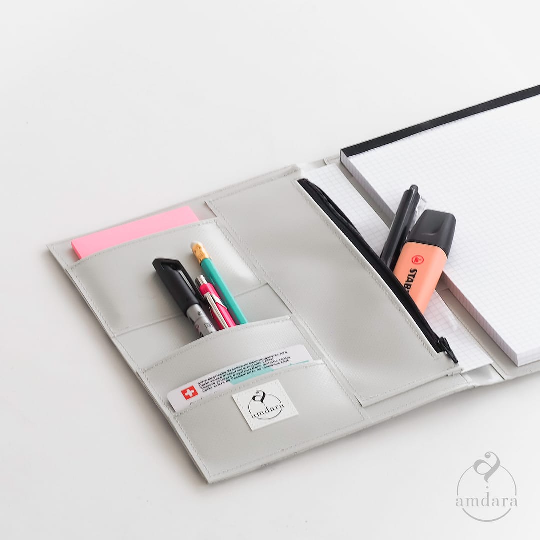 Wegen der handlichen Grösse kannst du die Mappe gut in Rucksack oder Handtasche verstauen. Neben Schreibblock und Zettel in A5 kannst du in dieser Mappe auch Büromaterial unterbringen.