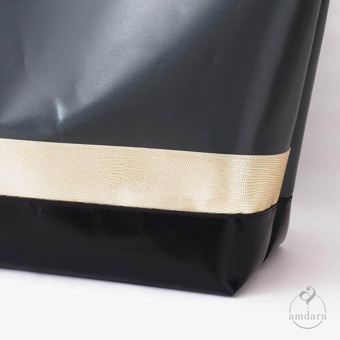 Der Shopper von amdara ist aus robuster Blache und ist sehr stabil verarbeitet, so dass er auch starken Belastungen stand hält. Die Tasche hat auch einen verstärkten Boden. Das Volumen des Shoppers entspricht in etwa dem einer klassischen Einkaufstasche (Papiertüte von Migros oder Coop).