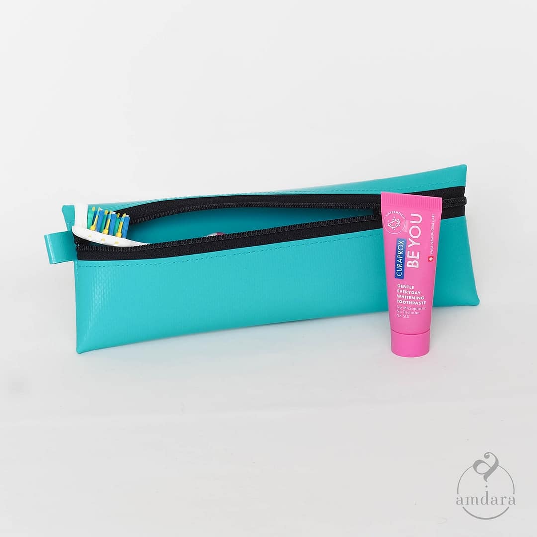Für Zahnbürste und Zahnpasta: In dieses Täschchen passt eine kleine Tube Zahnpasta und eine Zahnbürste (Kinderzahnbürste, Erwachsenen Zahnbürste je nach Modell). So ist unterwegs die Zahnbürste schnell griffbereit oder die Zahnbürste im Necessaire geschützt. Wie alle amdara Produkte aus Blache, kann auch dieses gut ausgewaschen und desinfiziert werden.