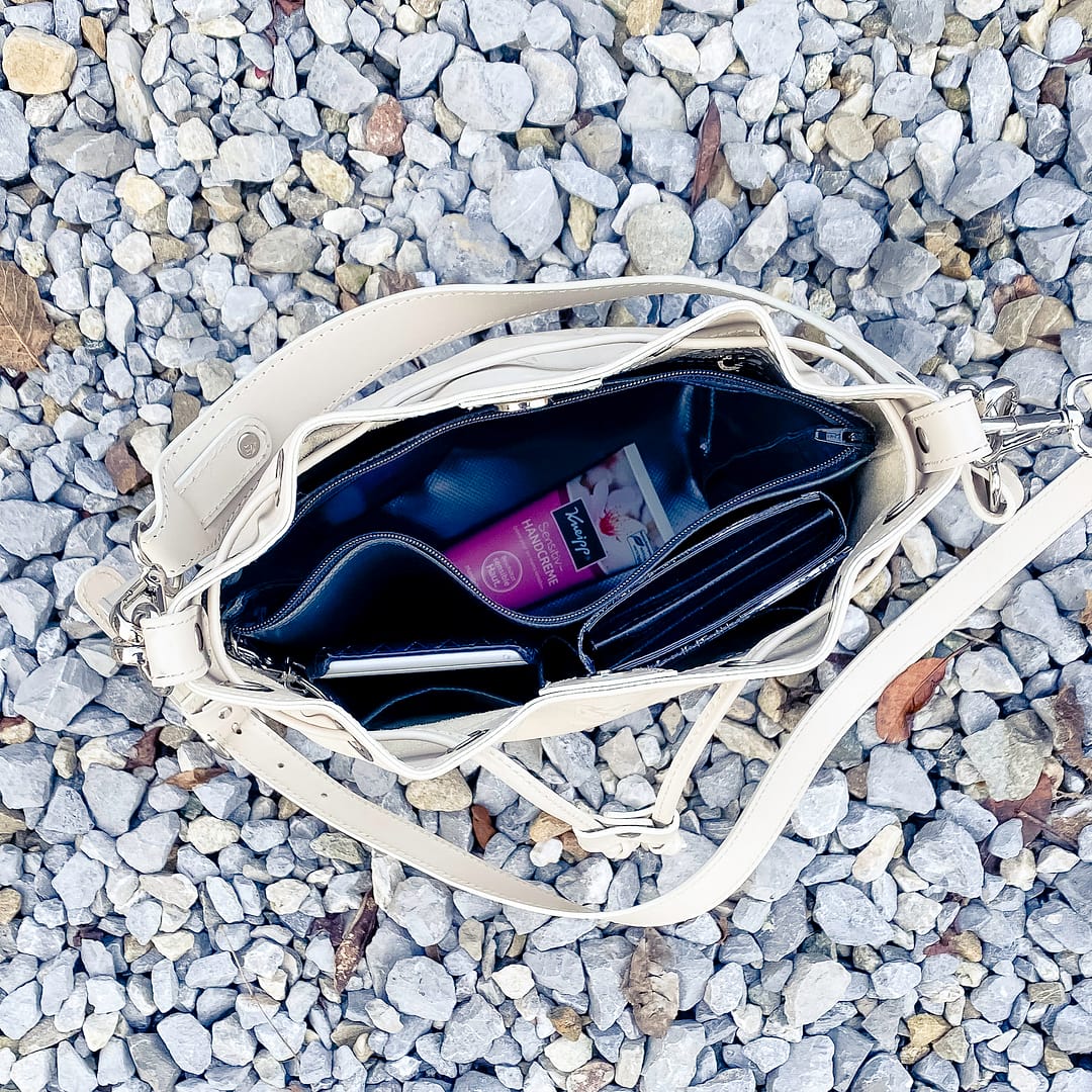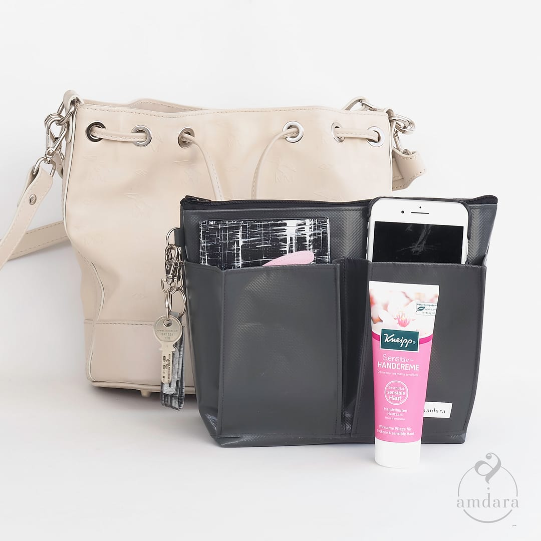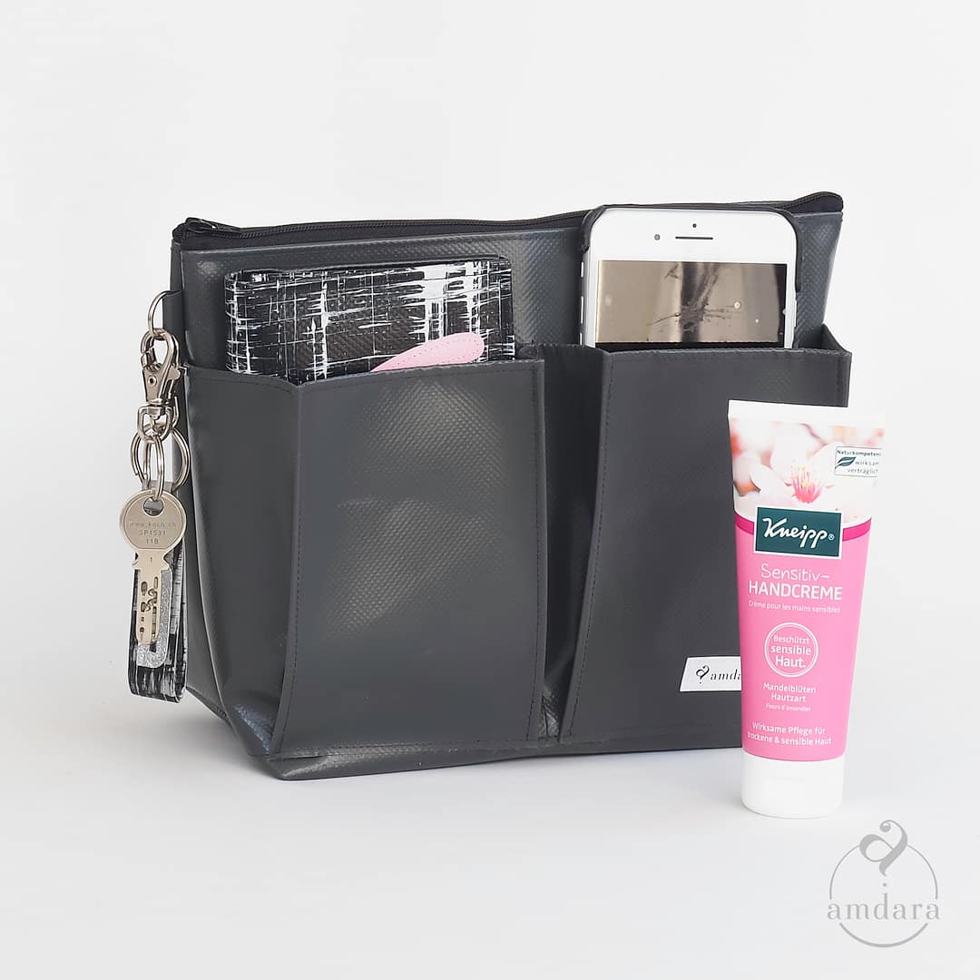 Der Taschenorganizer Beuteltasche bringt Ordnung in deine Handtasche oder in deinen Rucksack. Er ist ausgelegt für Beuteltaschen. Dank dem stabilen Material Blache hilft der Organizer auch, der Tasche mehr Stand zu geben.