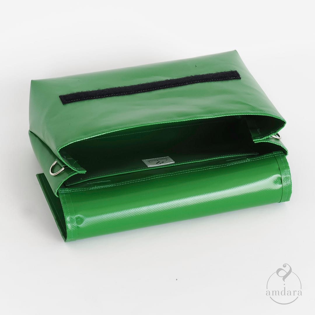 Das Velotäschchen hat ein flaches Innenfach, zum Beispiel für ein Portmonee oder ein kleines Buch. Das Täschchen wir mit einem Klettverschluss verschlossen. Je nach Inhalt wird der Deckel mehr oder weniger hoch zugeklappt.